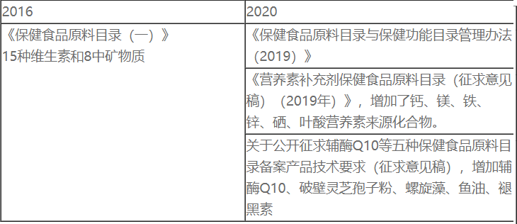 8 | 《营养素补充剂保健食品原料目录(征求意见稿)》和《允许营养素补充剂保健食品声称的保健功能目录(征求意见稿)》 | 2019 |