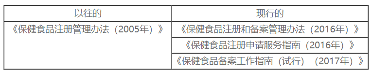 自2009年《中华人民共和国食品安全法》第五十一条从法律上确认保健食品的法律地位,保健食品在《中华人民共和国食品安全法》中体现也从一条法律条文(2000年《中华人民共和国食品安全法》第五十一条),发展到了专门的一节法律条文(2019年《中华人民共和国食品安全法》第四节 特殊食品)。保健食品的严格监管,也从单一的注册(《保健食品注册管理办法(试行版)(2005年)》)向备案和注册(《保健食品注册和备案管理办法(2016年)》)并行的方式进行转变。法律法规的变化,同时监管机构的改变,保健食品的法规已经发生了显著的改变。