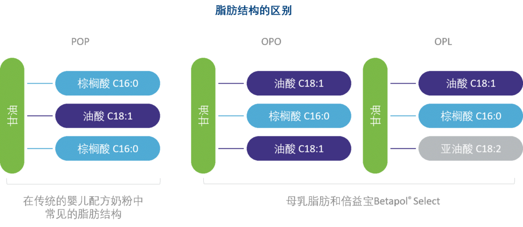 - 倍益宝Betapol® Select: 高SN-2位棕榈酸甘油三酯含量搭配均衡OPO和OPL(亚油酸位于SN-1或SN-3位)还原中国妈妈天然乳脂成分。