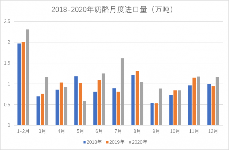 2020年累计进口大包奶粉97.93万吨,同比减少3.5%,进口额32.91亿美元,同比增长5.3%,平均价格为3360美元/吨,同比上涨9.1%。其中,从新西兰进口69.52万吨,占70.99%,同比减少7.92%,从欧盟进口12.27万吨,占12.52%,同比减少9.6%,从澳大利亚进口7.73万吨,占7.89%,同比增加13.23%。