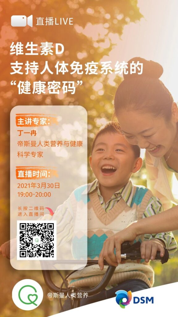 3月30日,帝斯曼人类营养与健康事业部将带来一场主题为“维生素D支持人体免疫系统的‘健康密码’”的线上讲座,由资深科学家介绍维生素D对人体免疫系统的重要作用,以及如何帮助人体更快达到维生素D的最佳水平。如果您想学习更多与营养健康相关的知识,欢迎扫描下方二维码报名: