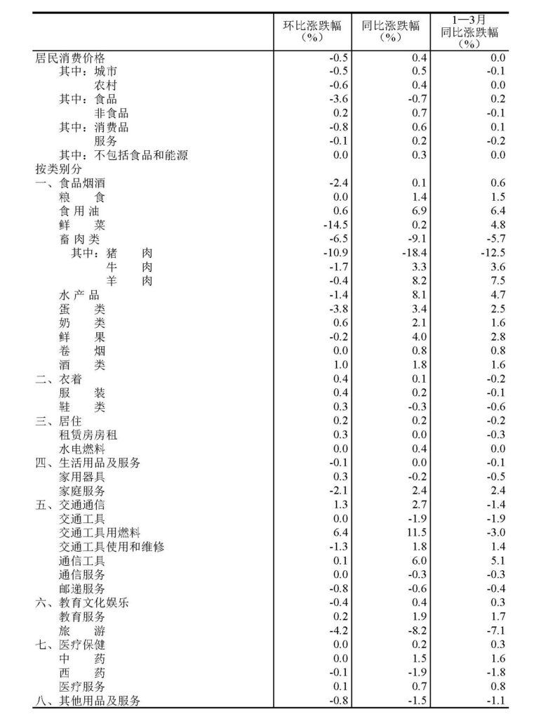 3月份,全国居民消费价格环比下降0.5%。其中,城市下降0.5%,农村下降0.6%;食品价格下降3.6%,非食品价格上涨0.2%;消费品价格下降0.8%,服务价格下降0.1%。