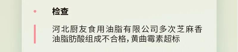 4月,邢台市市场监管局执法人员对河北厨友食用油有限公司生产经营8批次的芝麻香油、芝麻酱进行了秘密取样,检验发现,多批次芝麻香油的脂肪酸组成成分不合格,芝麻酱中检出花生成分,且黄曲霉素超标。