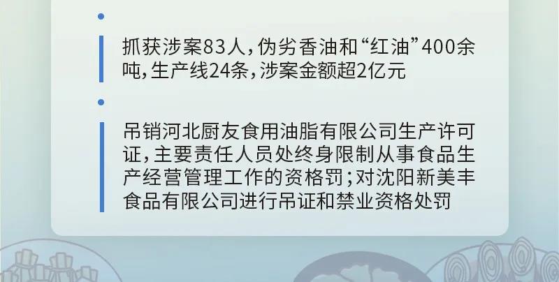 目前,该案捣毁了涉及12省份的特大生产经营伪劣香油违法犯罪网络,抓获涉案人员83人,查获伪劣香油和“红油”等400余吨、生产流水线24条,涉案金额超2亿元;10名主要嫌疑人一审被判有期徒刑1年6个月到8年不等,并被处以罚金。河北厨友食用油有限公司的生产许可证已被依法吊销,相关法定代表人、直接负责人等被处以禁业限制。
