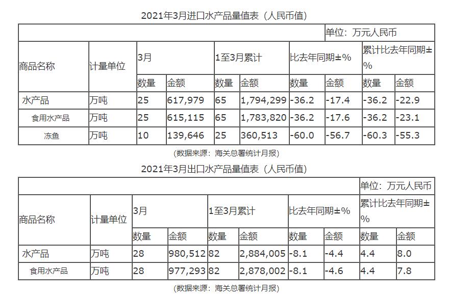 统计月报显示,2021年3月水产品进口量为25万吨,同比减少36.2%;进口金额为617,979万元人民币,同比减少17.4%;2021年3月水产品出口量为28万吨,同比减少8.1%;出口金额为980,512万元人民币,同比减少4.4%。