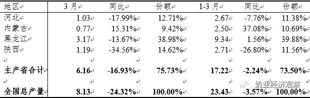 1-3月,奶粉产量前4省份中,河北、陕西产量同比下降,4省份合计17.22万吨,同比下降2.24%,占全国总产量73.50%,黑龙江产量第一,9.34万吨,同比增长1.56%,占总产量的39.88%。3月,这4省份奶粉产量只有内蒙古同比增长,产量合计6.16万吨,同比下降16.93%,占当月全国总产量的75.73%,黑龙江3.17万吨,同比下降13.67%,占当月全国总产量的38.98%。