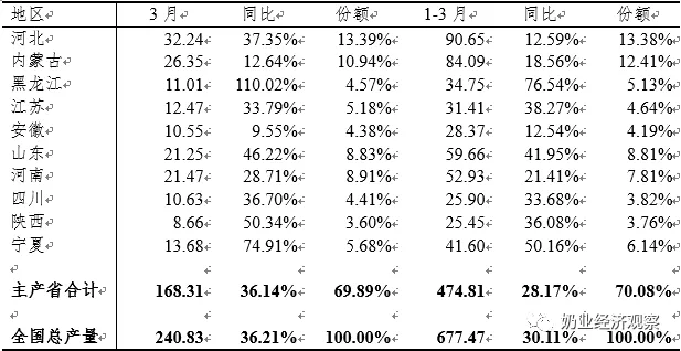 1-3月,液态奶产量前10位省份同比全部正增长,合计474.81万吨,同比增长28.17%,占全国总产量的70.08%,河北产量90.65万吨,同比增长12.59%,占全国总产量的13.38%,位居全国第一位。3月,这10个省份产量同比全部正增长,产量合计168.31万吨,同比增长36.14%,占当月全国总产量的69.89%,河北产量32.24万吨,同比增长37.35%,占当月全国总产量的13.39%。