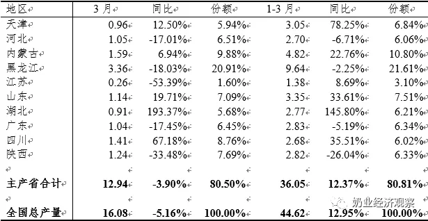 1-3月,干乳制品产量前10位的省份中,河北、黑龙江、广东、陕西产量同比下降,其他省份产量同比增长,10省份产量合计36.05万吨,同比增长12.37%,占全国总产量的80.81%,黑龙江产量最高,9.64万吨,同比下降2.25%,占全国总产量的21.61%。3月,这10省份干乳制品产量合计12.94万吨,同比下降3.90%,占当月全国总产量的80.50%,黑龙江产量3.36万吨,同比下降18.03%,占当月全国总产量的20.91%。