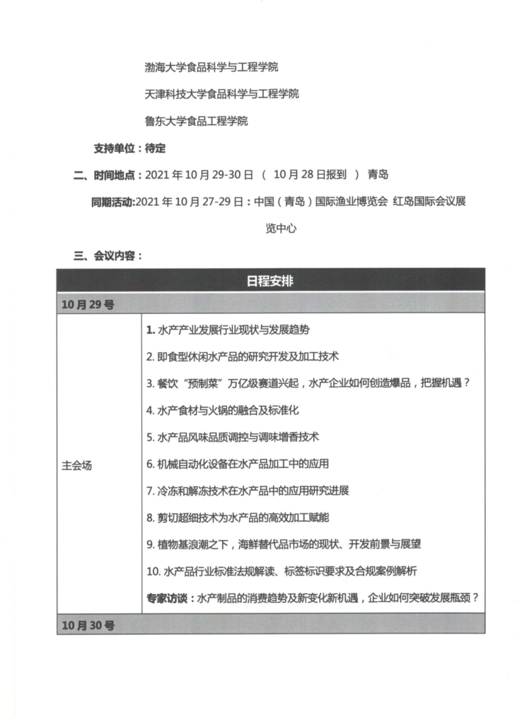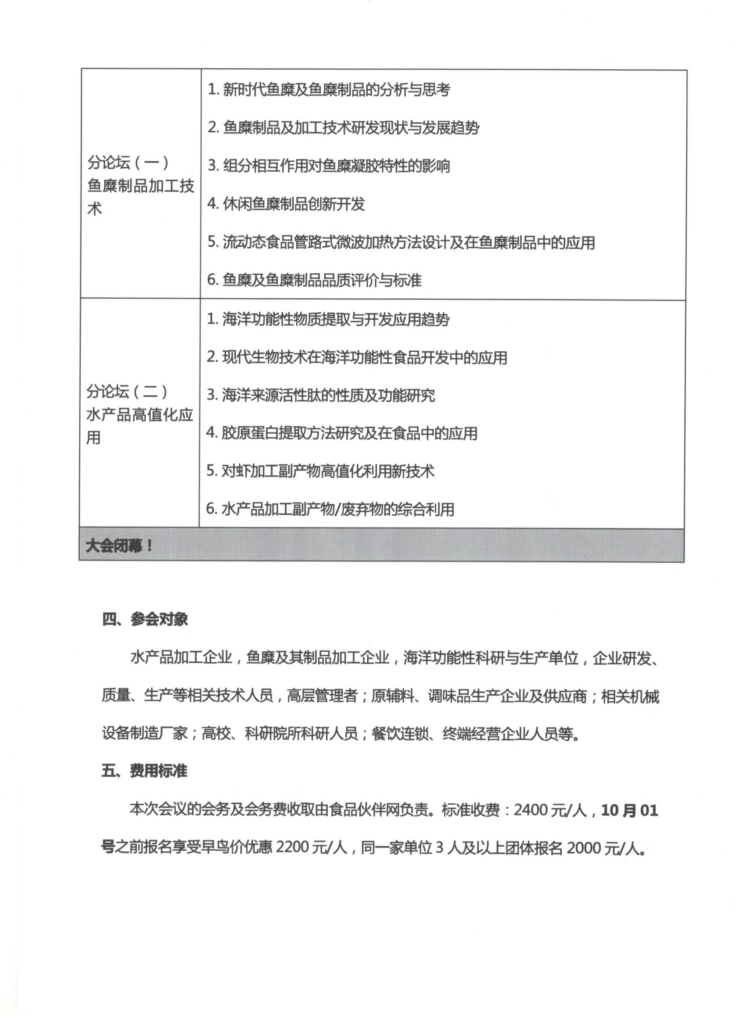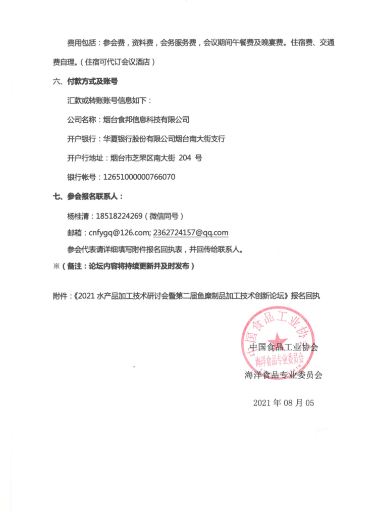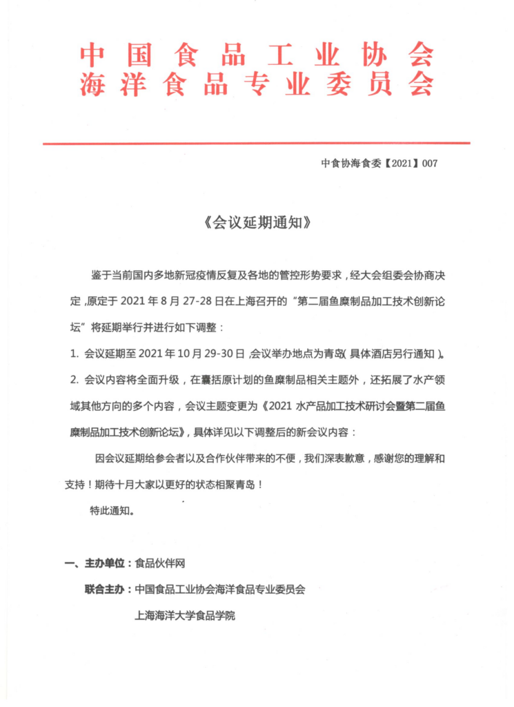 2021第二届鱼糜制品加工技术创新论坛 会议延期举行通知 王丽莉 来源: 华体会体育电子 海洋食品专业委员会 2021年8月5日 15:56 “第二届鱼糜制品加工技术创新论坛”将延期举行并进行如下调整。联系人:杨桂清,联系电话:18518224269;联系邮箱:cnfygq@126.com。 联系人:杨桂清,联系电话:18518224269;联系邮箱:cnfygq@126.com。 华体会体育电子 海洋食品专业委员会 2021年08月05日 会议延期通知.pdf下载 报名回执-《2021 水产品加工技术研讨会暨第二届鱼糜制品加工技术创新论坛》.doc下载