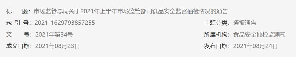 市场监管总局关于2021年上半年 市场监管部门食品安全监督抽检情况的通告〔2021年第34号〕
