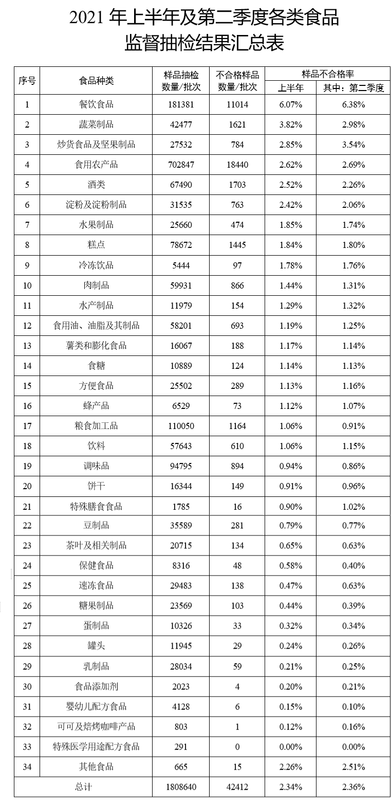 附件:2021年上半年及第二季度各类食品监督抽检结果汇总表