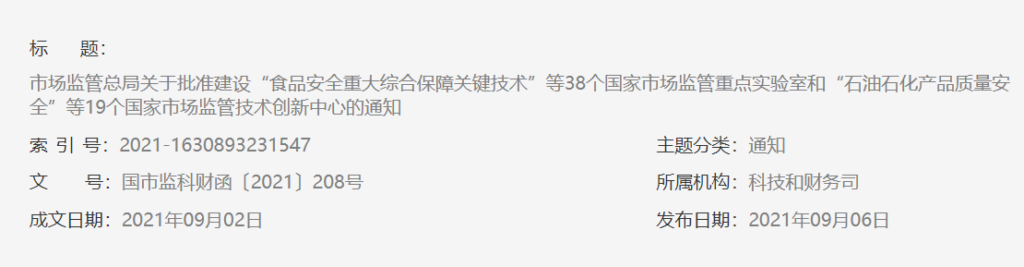 市场监管总局关于批准建设“食品安全重大综合保障关键技术”等38个国家市场监管重点实验室和“石油石化产品质量安全”等19个国家市场监管技术创新中心的通知