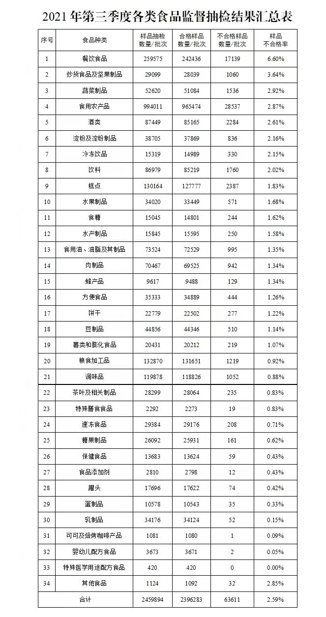 据市场监管总局消息,近日公布第三季度食品安全抽检情况。数据显示,2021年第三季度,全国市场监管部门完成食品安全监督抽检2459894批次,依据有关食品安全国家标准等检验,检出不合格样品63611批次,总体不合格率为2.59%,较2020年同期上升0.37个百分点。