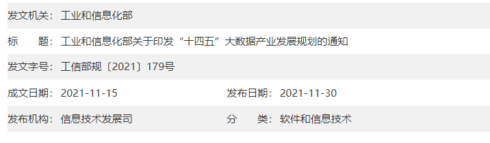 11月30日,工信部正式发布《“十四五”大数据产业发展规划》(以下简称《规划》)。