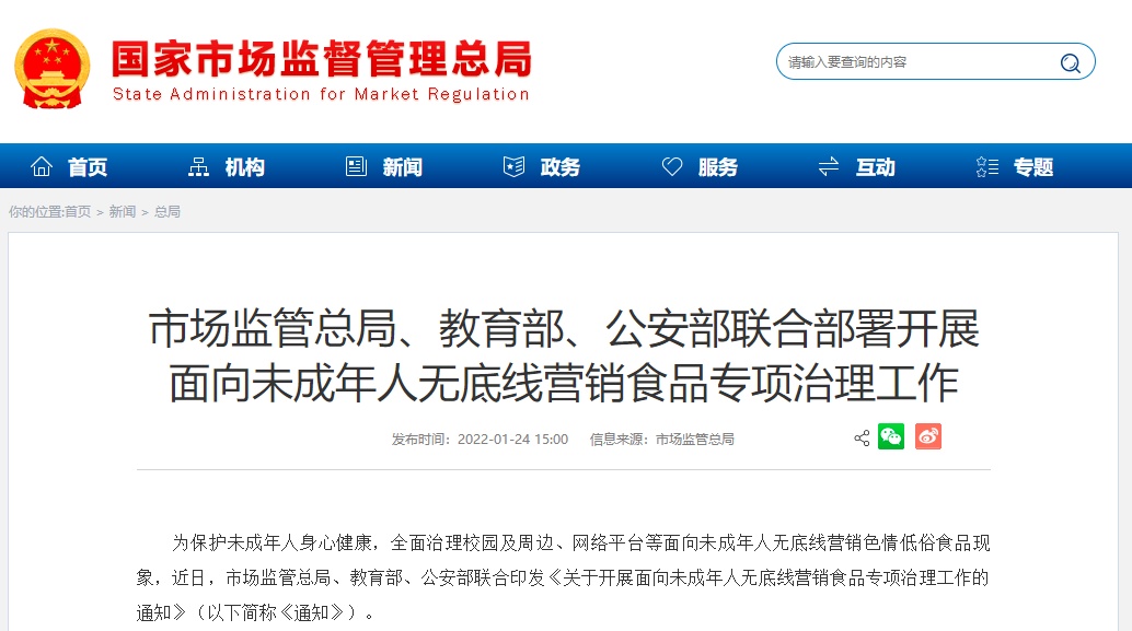 据国家市场监督管理总局消息,为保护未成年人身心健康,全面治理校园及周边、网络平台等面向未成年人无底线营销色情低俗食品现象,近日,市场监管总局、教育部、公安部联合印发《关于开展面向未成年人无底线营销食品专项治理工作的通知》(以下简称《通知》)。其中要求,严禁校园及周边的食品经营者采购、贮存和销售包装或标签标识具有色情、暴力、不良诱导形式或内容危害未成年人身心健康的食品。