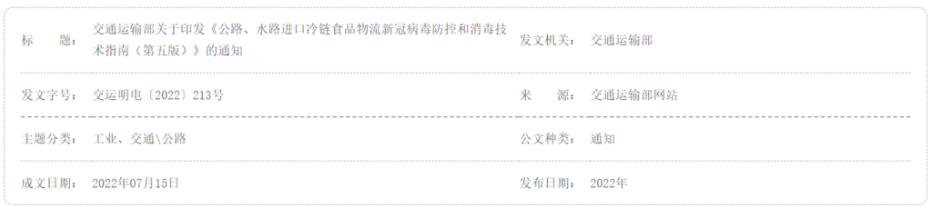 交通运输部关于印发《公路、水路进口冷链食品物流 新冠病毒防控和消毒技术指南(第五版)》的通知(交运明电〔2022〕213号)