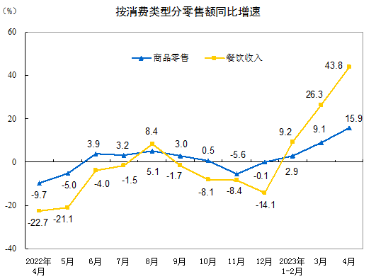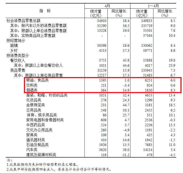 按消费类型分,4月份,商品零售31159亿元,同比增长15.9%;餐饮收入3751亿元,增长43.8%。1—4月份,商品零售133945亿元,同比增长7.3%;餐饮收入15888亿元,增长19.8%。