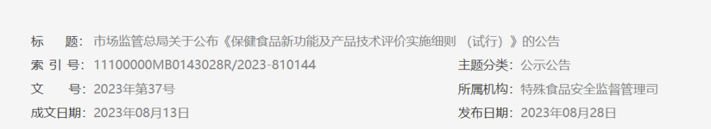 《保健食品新功能及产品技术评价实施细则(试行)》已经2023年6月15日市场监管总局第11次局务会议通过,现予公告,自公布之日起施行。 市场监管总局 2023年8月13日 市场监管…