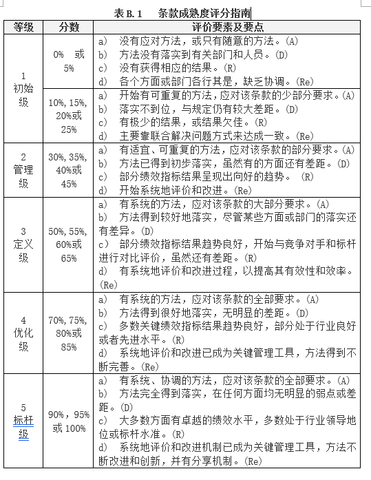 对每个条款,组织在开展定性评价的基础上,还可从成熟度评价的四个要素,依据以下评分指南(见表B.1)进行定量评价,即评分。