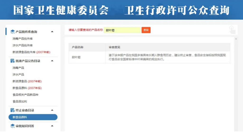 中国经济网记者从国家卫健委网站查询发现,作为甜菊糖苷主要原料的甜叶菊作为新食品原料的申请于2023年12月18日被作出“终止审查”决定。审查意见为,“鉴于该申报产品在我国多省具有长期人群食用历史,建议终止审查,食品安全指标按照我国现行食品安全国家标准中叶菜蔬菜的规定执行。”