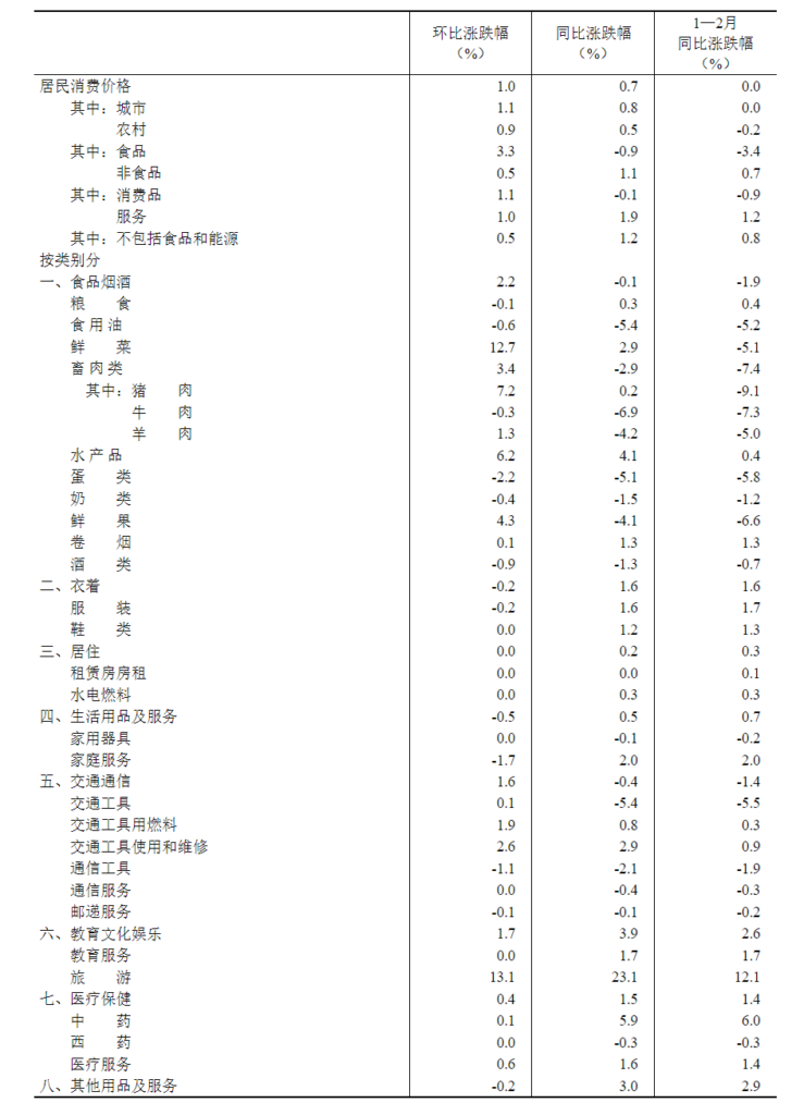 2月份,全国居民消费价格环比上涨1.0%。其中,城市上涨1.1%,农村上涨0.9%;食品价格上涨3.3%,非食品价格上涨0.5%;消费品价格上涨1.1%,服务价格上涨1.0%。
