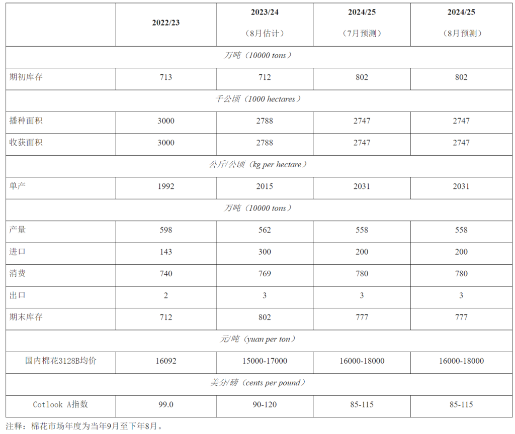 棉花:本月对中国棉花供需形势预测与上月保持一致。目前,大部棉花处于开花结铃期至裂铃吐絮期。新疆棉区综合气象条件适宜,棉花长势总体好于上年。当前棉花供给较为充裕,随着棉纺织市场“金九银十”开始备货,棉花需求有望逐步回升。全球棉花增产预期较强,需求存在较大不确定性,国际棉价维持低位震荡。后期需关注天气对各主产国棉花产量的影响。