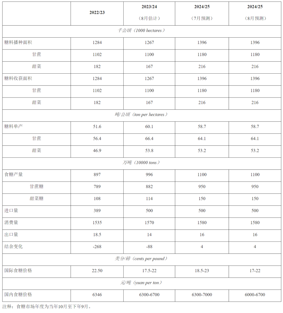 食糖:本月对中国食糖供需形势预测与上月保持一致。2023/24年度全国食糖销售接近尾声,截至7月底,全国累计销糖825万吨,同比增长11.8%;累计销糖率82.8%,同比加快0.5个百分点。7月份,云南西南部产区持续强降雨,广西北部产区降雨偏少,对甘蔗生长发育的不利影响有待观察;内蒙古、新疆甜菜长势良好。国际方面,巴西中南部正处于压榨高峰期,产量和出口均维持高位,北半球印度、泰国降雨增加利于甘蔗生长,叠加市场担心印度食糖出口禁令可能松动,国际糖价以弱势运行为主,国际压力传导,国内糖价承压。后期需关注巴西、印度和泰国天气及印度食糖出口政策变化等情况。