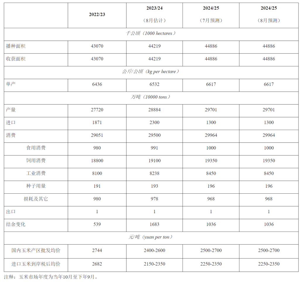 玉米:本月对中国玉米2024/25年度供需形势预测与上月保持一致。近期,东北产区大部热量条件较好、华北产区土壤墒情适宜,总体利于作物生长,新疆产区大部出现高温天气,不利于作物灌浆。据中国气象局评估,今年玉米播种以来全国产区平均气候适宜度为适宜等级,黑龙江气温较常年略偏低,后期有发生阶段性低温冷害的可能。国内市场,玉米供应进入传统青黄不接时间段,但多数地区贸易环节库存同比偏多。国际市场,美国玉米种植带天气条件利于作物生长,叠加近期美国玉米周度出口销售量持续低于市场预期,国际玉米价格低位运行。