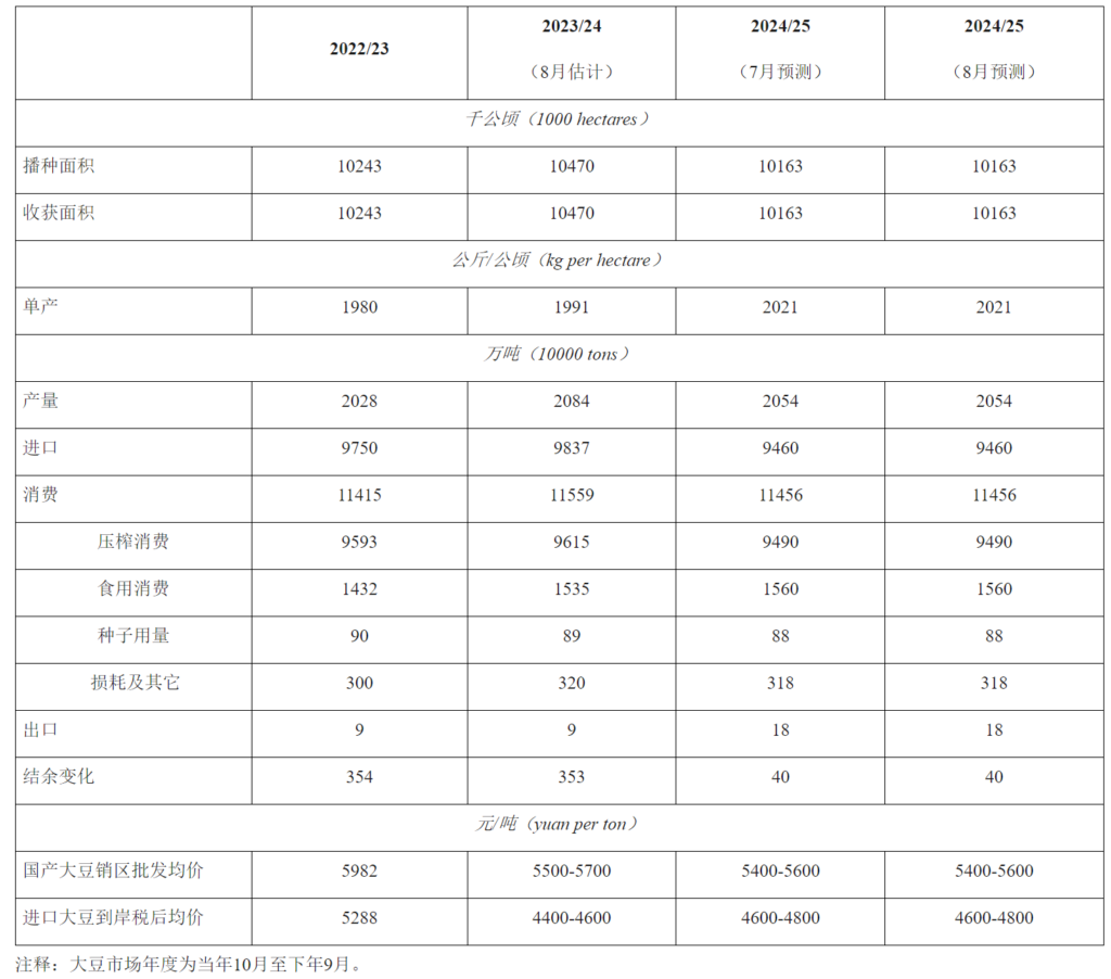 本月对2024/25年度中国大豆供需形势预测与上月保持一致。东北主要产区土壤墒情、光照适宜,利于大田作物生长发育,大部分区域新季大豆长势良好,目前普遍由开花结荚期向鼓粒期过渡。美国中西部大豆主产区风调雨顺,新作丰产预期强烈,因销售进度缓慢,农场陈豆库存处于历史同期高位,加上南美当季大豆剩余量较多,全球大豆市场供应压力较大。