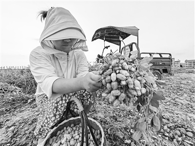 农民在地里忙着收获花生。陈保忠/视觉中国