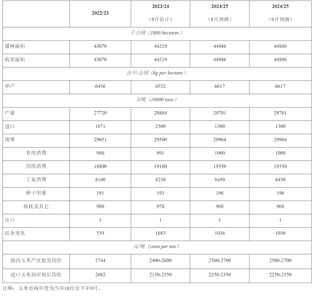 玉米:本月对中国玉米供需形势预测与上月保持一致。据中国气象局评估,今年玉米播种以来全国产区平均气候适宜,突发洪涝等灾害偏多但影响整体有限,总体利于玉米生长、收获。国内市场,新季玉米陆续上市,饲用消费稳步增加,玉米深加工开工率保持高位,玉米市场运行总体平稳。国际市场,全球玉米保持丰产预期,供需格局仍偏宽松,预计国际玉米价格低位震荡运行。