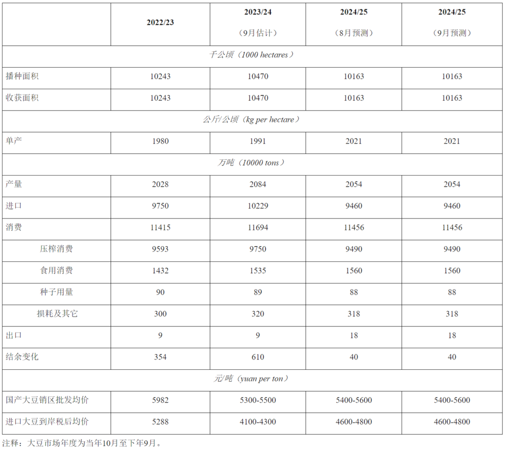 本月对2024/25年度中国大豆供需形势预测与上月保持一致。东北主要产区土壤墒情适宜,大豆已经陆续进入鼓粒期,今年大豆有望获得丰收。美国新作大豆产量有望创下历史新高,北半球大豆即将迎来集中上市季,全球大豆供应形势保持宽松状态。