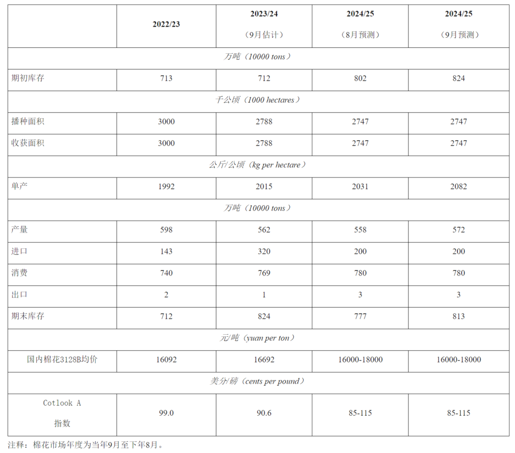 今年全国棉区综合气象条件适宜,病虫害轻度发生,棉花长势总体好于上年,预期单产增加,本月将2024/25年度产量调增至572万吨,较上年度增1.8%。当前部分地区新棉零星上市,开秤价低于去年,预计新疆集中上市时间提前至9月末,随着棉纺市场传统旺季临近,棉花需求有望回升。