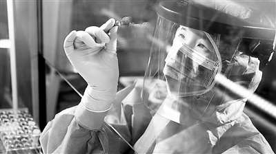 中国科学院古脊椎动物与古人类研究所研究员付巧妹在该所古DNA超净室中对奶酪样本进行实验。