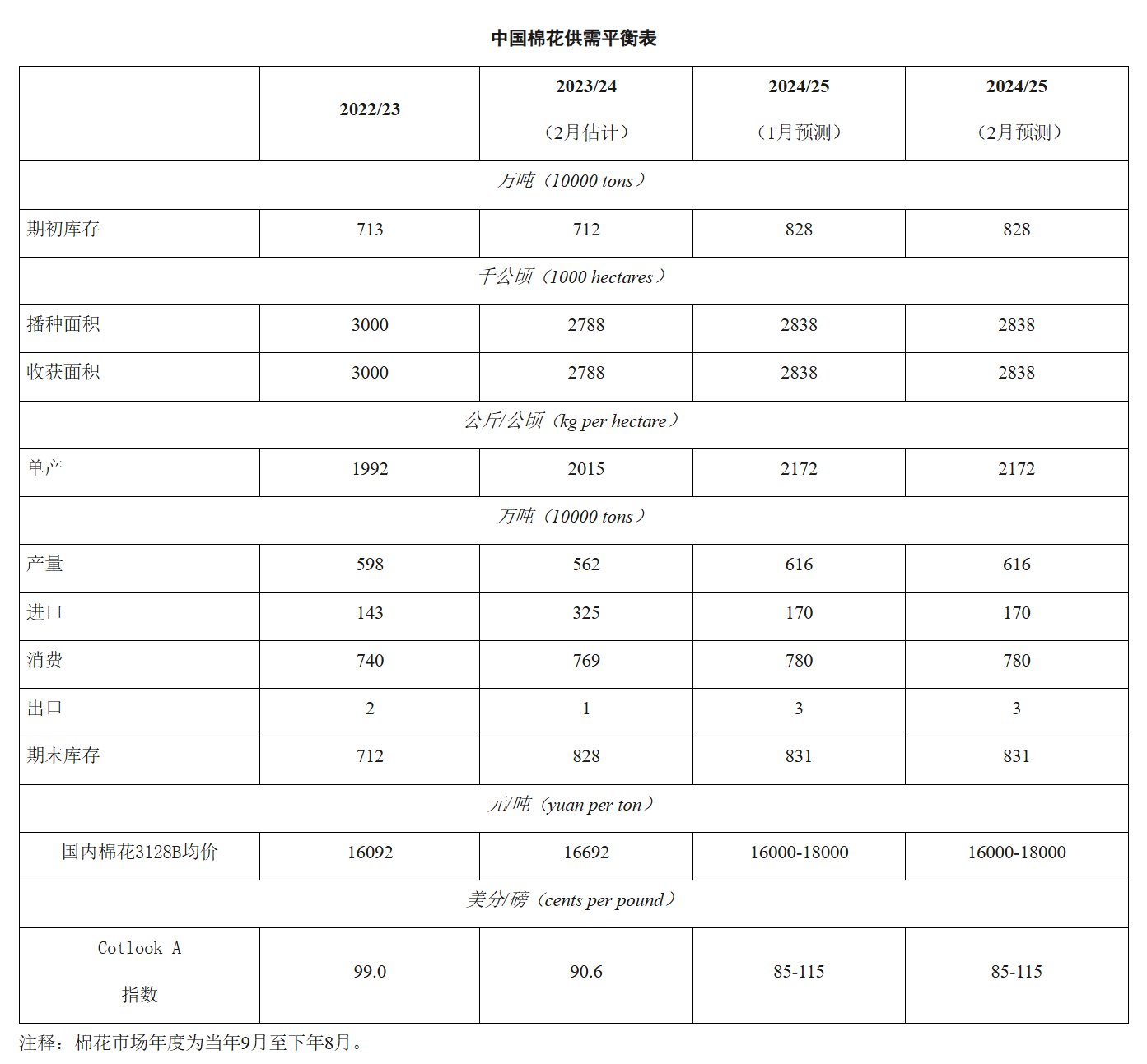 棉花:本月对2024/25年度中国棉花供需形势预测与上月保持一致。据国家棉花市场监测系统数据,截至2月6日,全国棉花销售率为40.6%,同比提高4.7个百分点,较过去四年均值提高1.1个百分点。节后纺织企业陆续恢复生产,随着“金三银四”传统旺季到来,市场活跃度将有所提升。