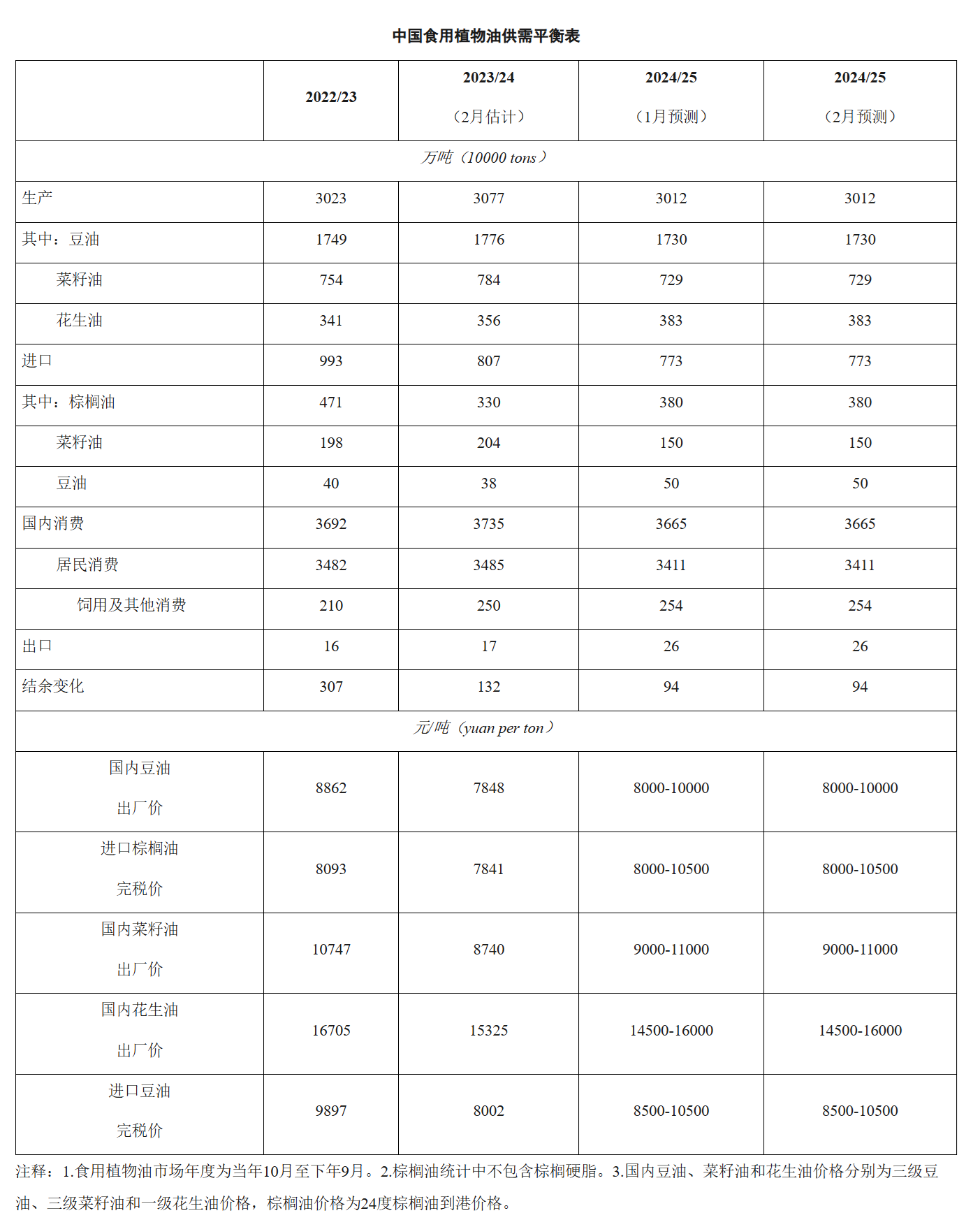 食用植物油:本月预测,2024/25年度中国食用植物油产量、消费量、进出口量均与上月保持一致。南方大部地区光热水匹配程度较好,利于油菜生长发育。截至1月末,四川盆地大部、长江中下游等地处于现蕾至抽薹期,长势总体好于上年。本月暂不对油菜籽产量进行调整。食用植物油首席分析师 李淞淋