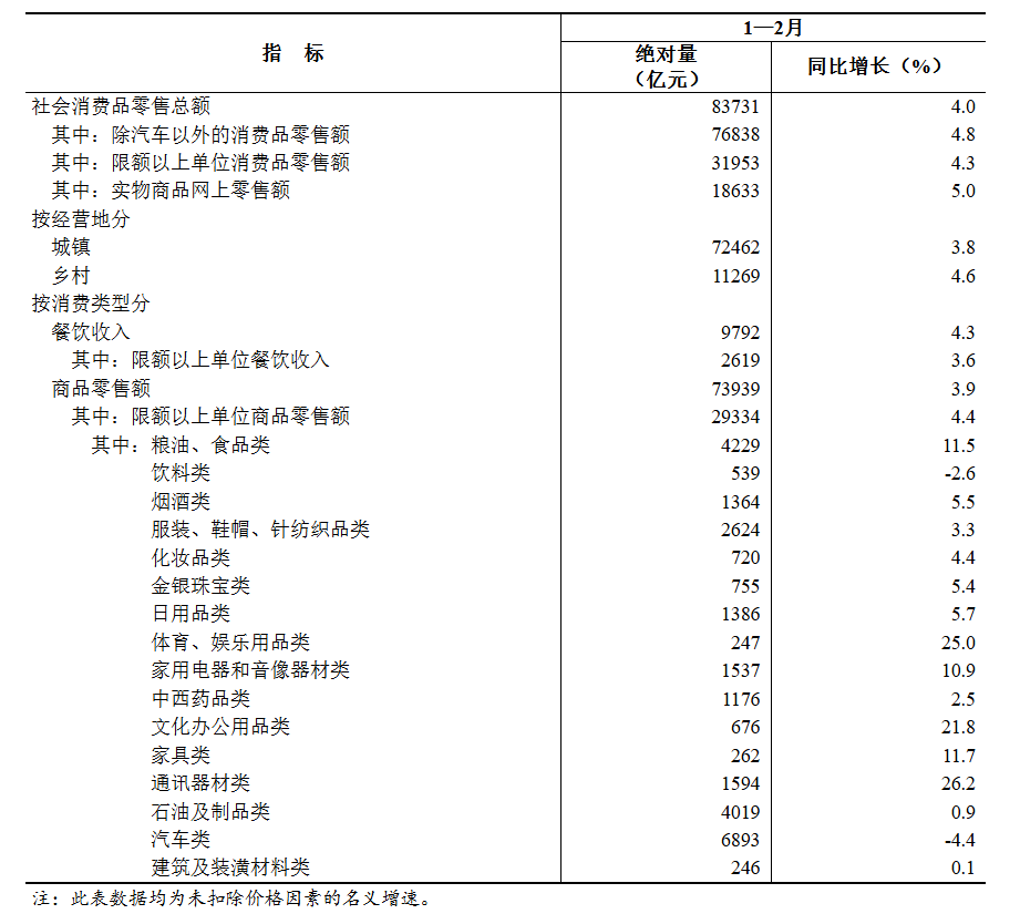 1—2月份,社会消费品零售总额83731亿元,同比增长4.0%。其中,除汽车以外的消费品零售额76838亿元,增长4.8%。
