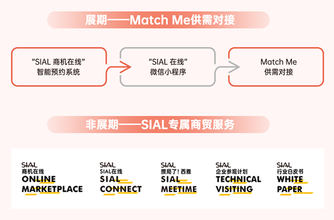 此外,SIAL西雅展全年提供专属商贸服务,包含SIAL商机在线、SIAL在线、SIAL攒局了!西雅、SIAL企业参观计划、SIAL食采节等一系列商贸服务,为食品饮料企业与采访提供多元供需对接服务,促成商贸沟通交流。