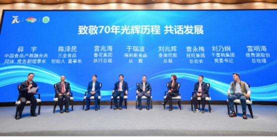 致敬食品工业发展70年,聚焦食品行业趋势,三全食品股份有限公司创始人陈泽民,鲁花集团执行总裁宫兆海,山东得利斯食品股份有限公司总裁于瑞波,香驰控股有限公司总裁刘兆辉,上海旺旺食品集团有限公司总处长曹永梅,千喜鹤集团有限公司党委书记刘乃纲,北京德青源农业科技股份有限公司总经理宣明海,就我国食品行业发展面临的挑战和机遇展开深入探讨。论坛由中国食品产教融合共同体常务副理事长、江苏食品药品职业技术学院党委书记薛宇主持。