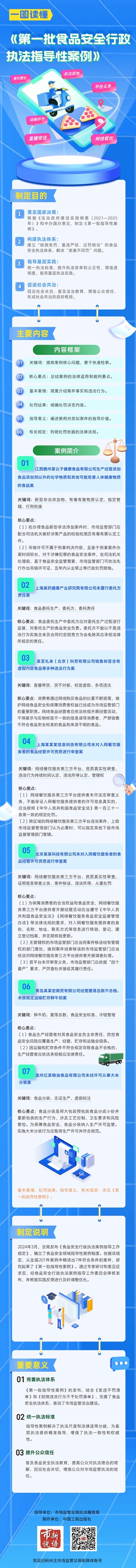 《第一批指导性案例》共包含7个案例,涵盖食品中非法添加新型药品衍生物、企业未履行委托责任、直播带货经营食品存在多种违法行为、网络餐饮服务第三方平台未履行法定义务、未按规定运输食品、未经许可从事食品分装等违法行为。每个案例均包含关键词、核心要点、基本案情、处罚结果、指导意义、引用规定六部分内容,通过说理方式讲解裁判要点和处罚重点。各级市场监管部门在办理类似案件时,可以引述指导性案例进行说理,参照其进行定性和裁量。
