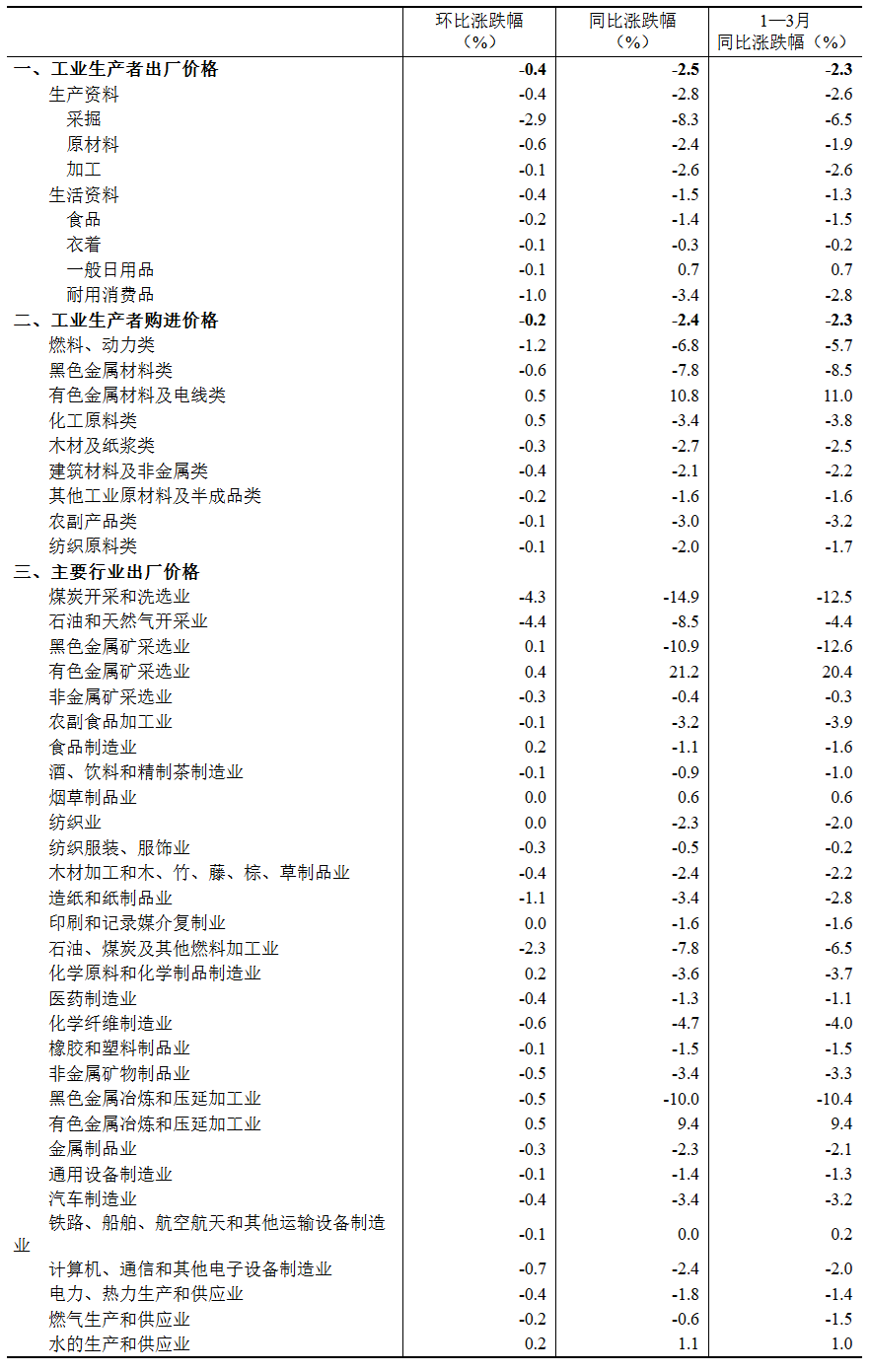 3月份,工业生产者出厂价格中,生产资料价格下降0.4%,影响工业生产者出厂价格总水平下降约0.30个百分点。其中,采掘工业价格下降2.9%,原材料工业价格下降0.6%,加工工业价格下降0.1%。生活资料价格下降0.4%,影响工业生产者出厂价格总水平下降约0.11个百分点。其中,食品价格下降0.2%,衣着和一般日用品价格均下降0.1%,耐用消费品价格下降1.0%。