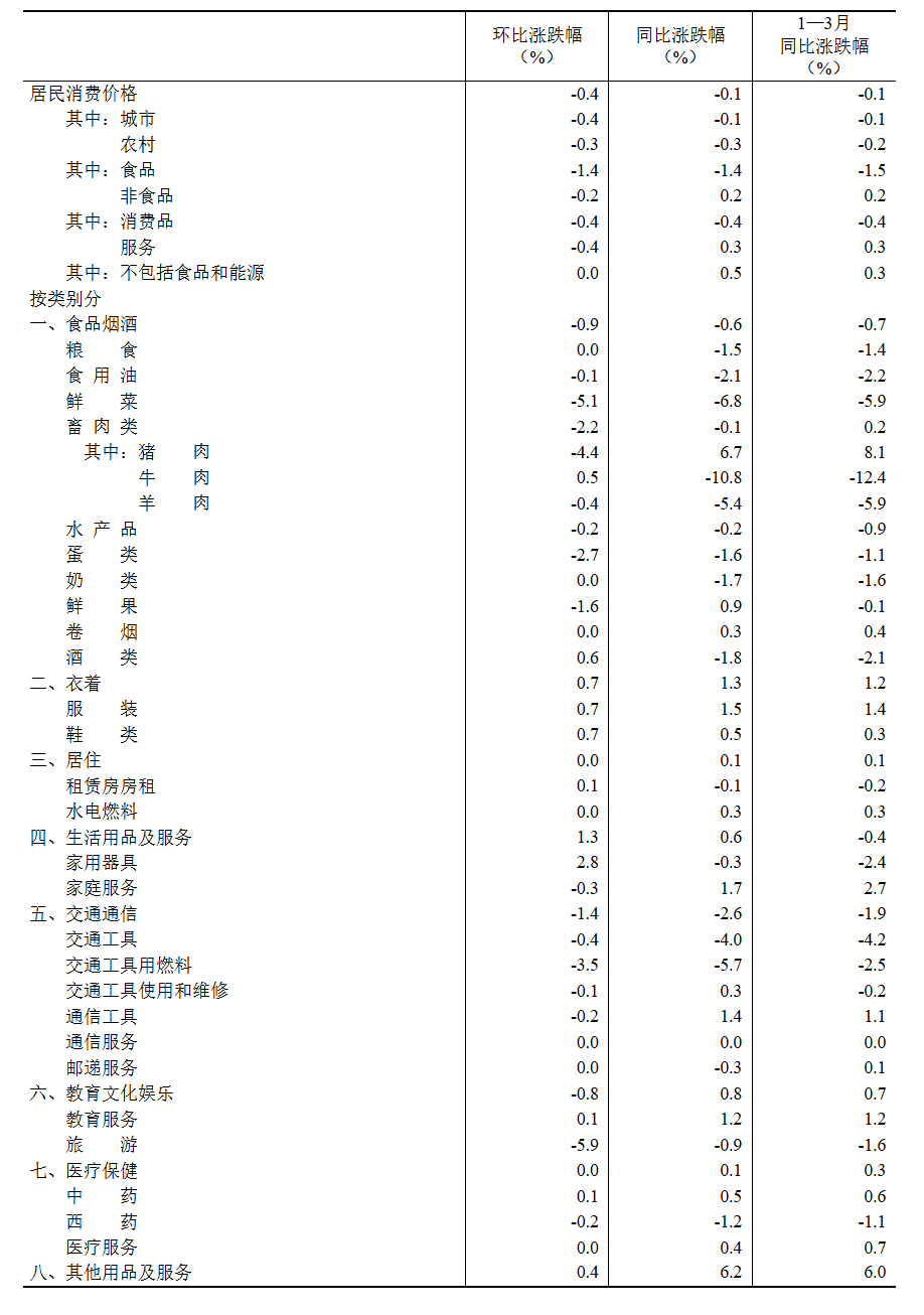3月份,全国居民消费价格环比下降0.4%。其中,城市下降0.4%,农村下降0.3%;食品价格下降1.4%,非食品价格下降0.2%;消费品价格下降0.4%,服务价格下降0.4%。
