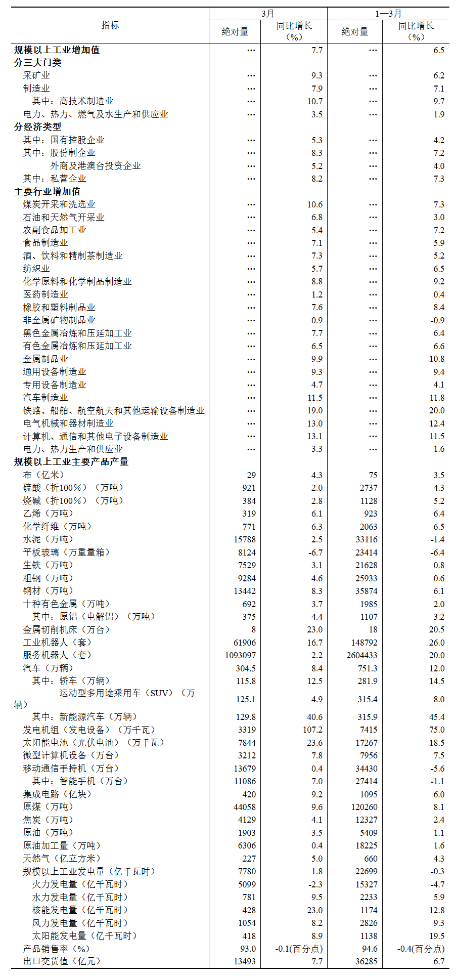 分产品看,3月份,规模以上工业623种产品中有405种产品产量同比增长。其中,钢材13442万吨,同比增长8.3%;水泥15788万吨,增长2.5%;十种有色金属692万吨,增长3.7%;乙烯319万吨,增长6.1%;汽车304.5万辆,增长8.4%,其中新能源汽车129.8万辆,增长40.6%;发电量7780亿千瓦时,增长1.8%;原油加工量6306万吨,增长0.4%。
