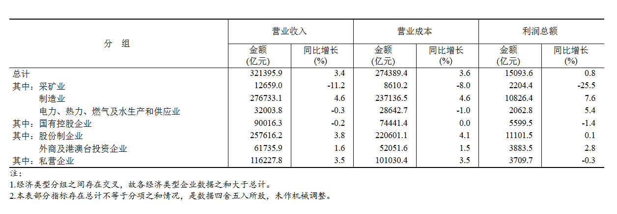 1—3月份,全国规模以上工业企业实现利润总额15093.6亿元,同比增长0.8%(按可比口径计算,详见附注二)。