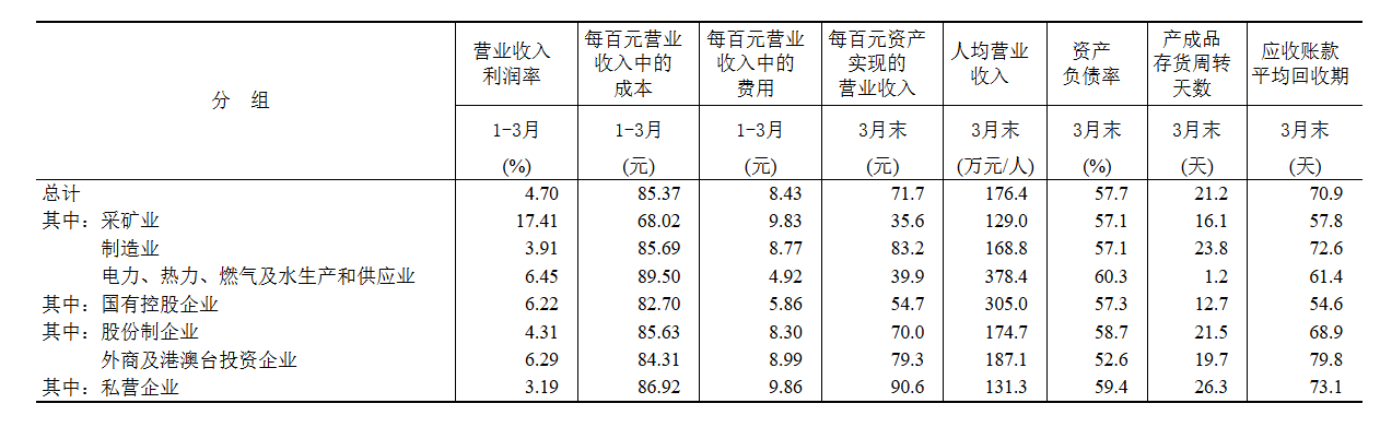 1—3月份,规模以上工业企业实现营业收入32.14万亿元,同比增长3.4%;发生营业成本27.44万亿元,增长3.6%;营业收入利润率为4.70%,同比下降0.12个百分点。