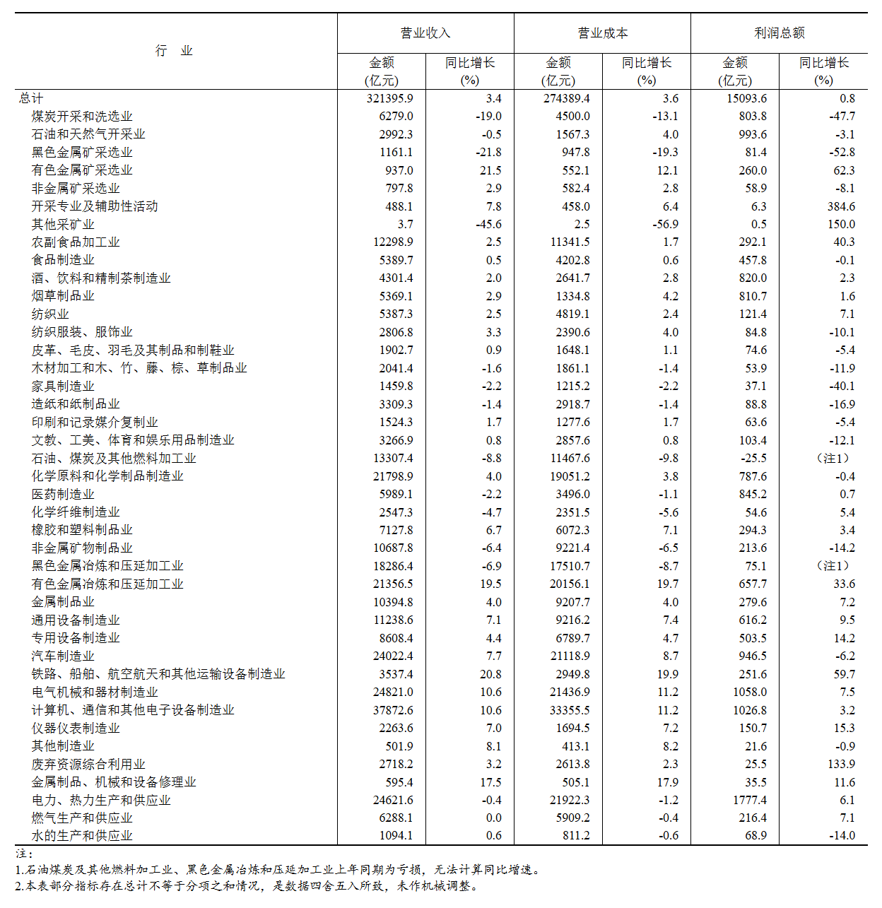 1—3月份,主要行业利润情况如下:农副食品加工业利润同比增长40.3%,有色金属冶炼和压延加工业增长33.6%,专用设备制造业增长14.2%,通用设备制造业增长9.5%,电气机械和器材制造业增长7.5%,纺织业增长7.1%,电力、热力生产和供应业增长6.1%,计算机、通信和其他电子设备制造业增长3.2%,化学原料和化学制品制造业下降0.4%,石油和天然气开采业下降3.1%,汽车制造业下降6.2%,非金属矿物制品业下降14.2%,煤炭开采和洗选业下降47.7%,石油煤炭及其他燃料加工业同比减亏,黑色金属冶炼和压延加工业同比由亏转盈。