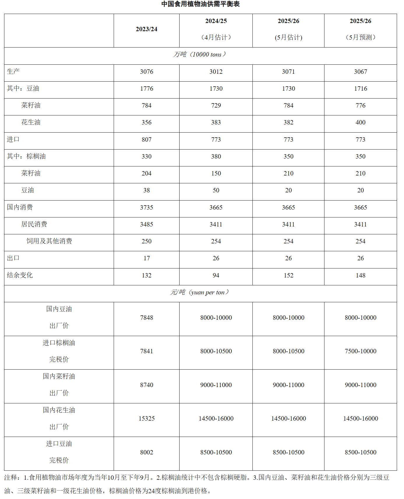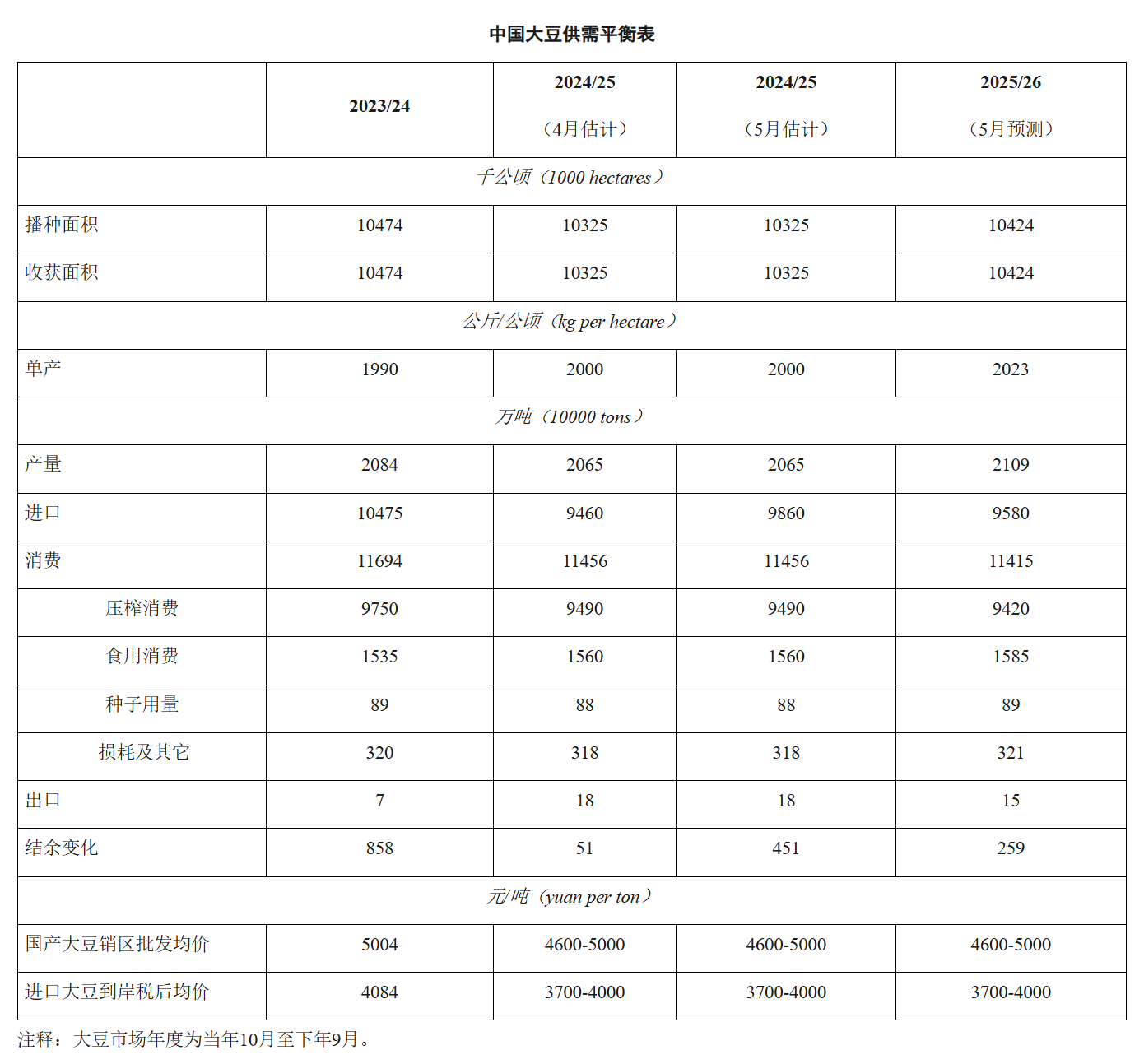 大豆:本月对2024/25年度中国大豆生产、消费估计值与上月一致,将大豆进口量上调400万吨至9860万吨,仍低于上年度水平,主要是南美新作大豆丰产,目前已进入供应旺季,出口中国数量高于预期。当前正值东北产区大豆春播关键时期,主产区大豆种植意愿总体稳定,土壤墒情良好,春播进度加快。预计2025/26年度中国大豆播种面积10424千公顷,较上年度增长1%;单产每公顷2023公斤,较上年度提高1.1%;产量保持在2000万吨以上。当前生猪产能处于合理区间,随着饲用豆粕减量替代技术的逐步推广,豆粕消费量将继续下降,大豆进口量相应减少;食用消费量保持稳中有增趋势。预计2025/26年度中国大豆进口量9580万吨,较上年度减少2.8%;大豆消费量1.14亿吨,与上年度基本持平。