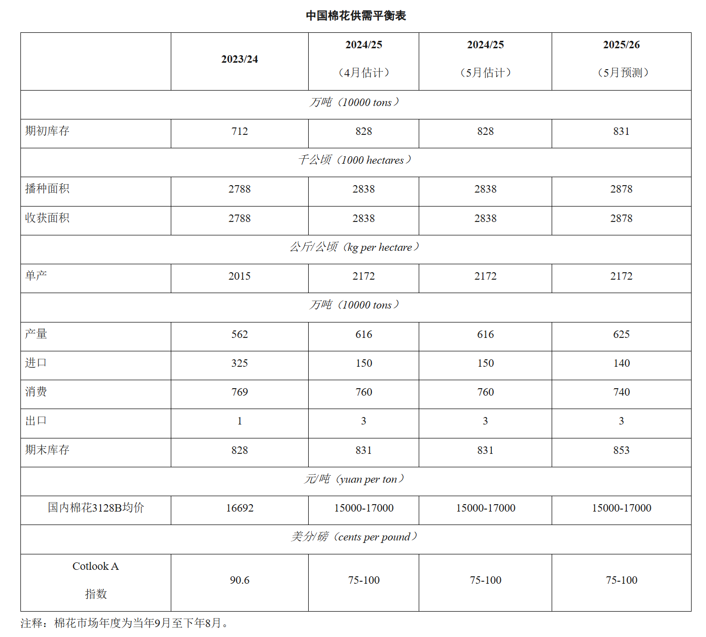 棉花:本月对2024/25年度棉花供需形势估计值与上月保持一致。本月预测,2025/26年度,中国棉花播种面积为2878千公顷(4317.0万亩),较上年度增1.4%。新疆棉花目标价格补贴政策稳定,棉农植棉积极性较高,面积稳中略增;内地棉区受比较效益低、机械化推广难度大等因素影响,面积继续下滑。棉花播种出苗期间主产区综合气候条件适宜,预计单产为每公顷2172公斤(每亩144.8公斤),与上年度持平。棉花产量625万吨,较上年度增1.4%。受美国滥施关税影响,棉花消费存在偏弱预期,但未来仍有一定不确定性,预计新年度棉花消费740万吨,较上年度小幅调减20万吨,进口量下调10万吨至140万吨。