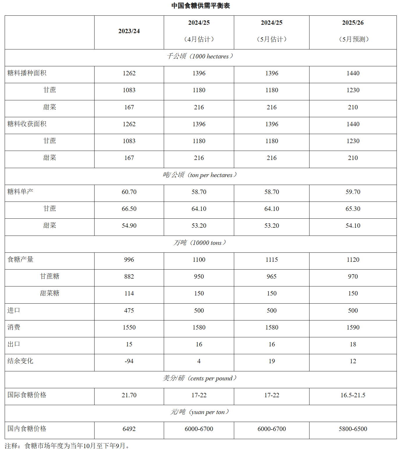食糖:据中国糖业协会统计,截至2025年4月底,全国累计产糖1111万吨,同比增115万吨。考虑到云南和广东实际产糖量高于预期,本月将2024/25年度中国食糖产量上调15万吨至1115万吨。本月预测2025/26年度中国糖料播种面积1440千公顷,较上年度增长3.2%,食糖产量增至1120万吨。主要由于糖料种植比较效益突出,加之国家政策和制糖企业大力支持,农民积极性提高,刺激糖料种植面积稳中有升,但广西前期干旱不利于宿根蔗出苗和新植蔗种植,限制食糖产量增幅。预计新年度食糖消费量持平略增,食糖产需缺口基本稳定,进口量保持500万吨不变。
