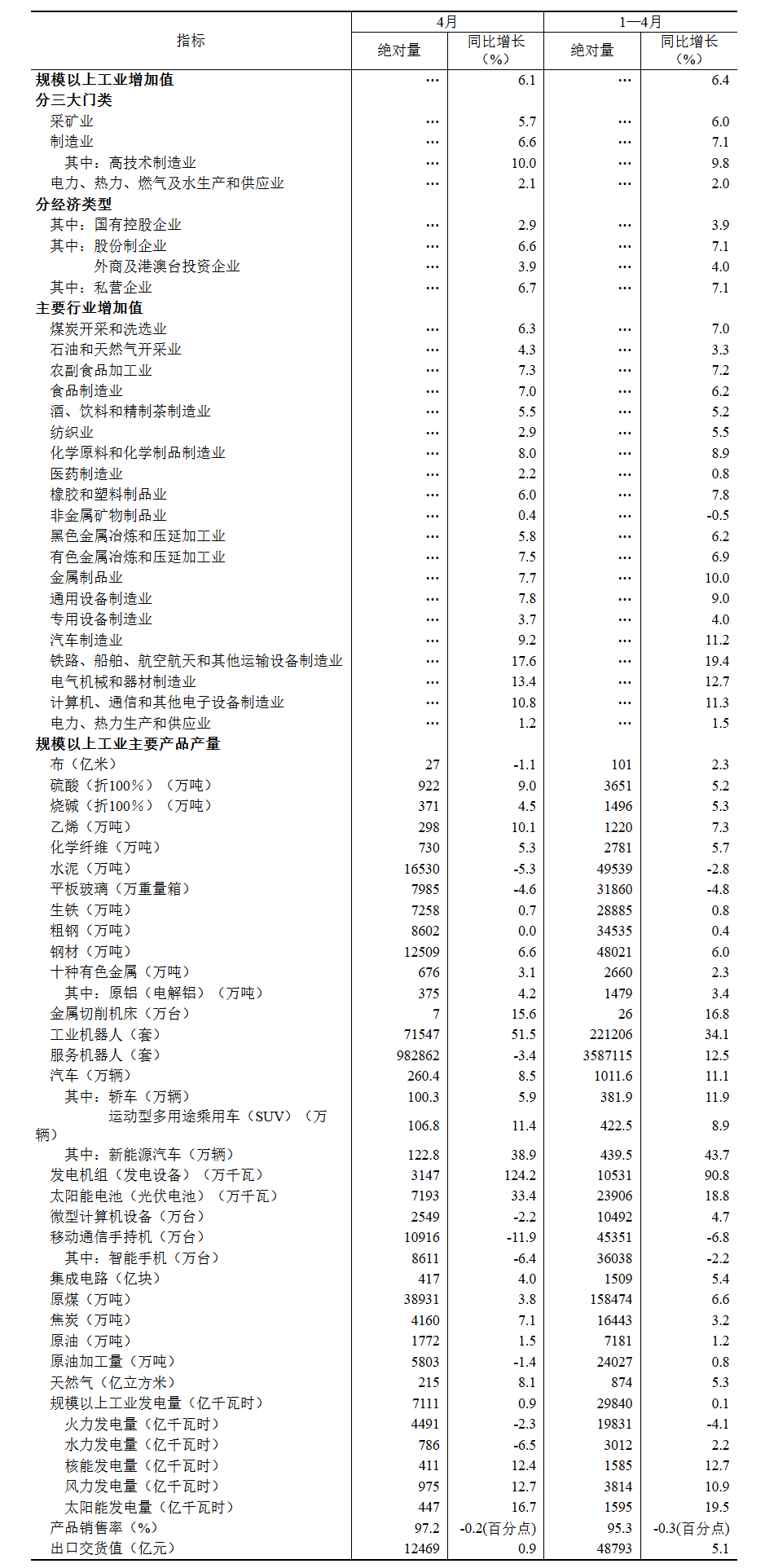 分产品看,4月份,规模以上工业623种产品中有341种产品产量同比增长。其中,钢材12509万吨,同比增长6.6%;水泥16530万吨,下降5.3%;十种有色金属676万吨,增长3.1%;乙烯298万吨,增长10.1%;汽车260.4万辆,增长8.5%,其中新能源汽车122.8万辆,增长38.9%;发电量7111亿千瓦时,增长0.9%;原油加工量5803万吨,下降1.4%。